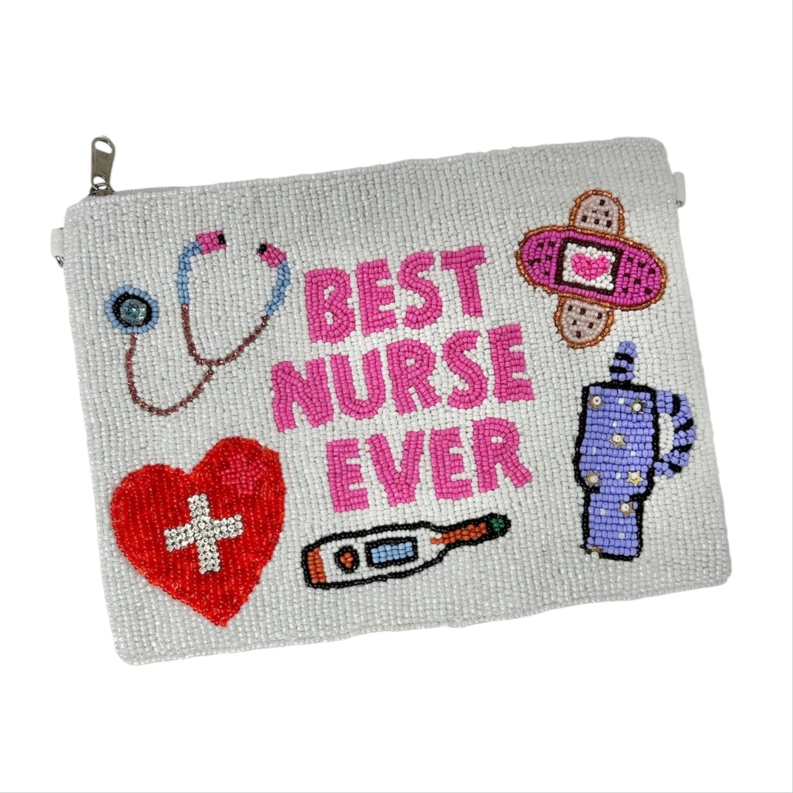This large hand-beaded pouch is a perfect gift for nurses, combining style and practicality. Its ideal size fits essential nurse tools or serves as a chic makeup bag. Featuring a silver chain, it doubles as a fashionable crossbody bag, keeping your items close and accessible throughout the day. Celebrate dedication with this versatile and elegant accessory.