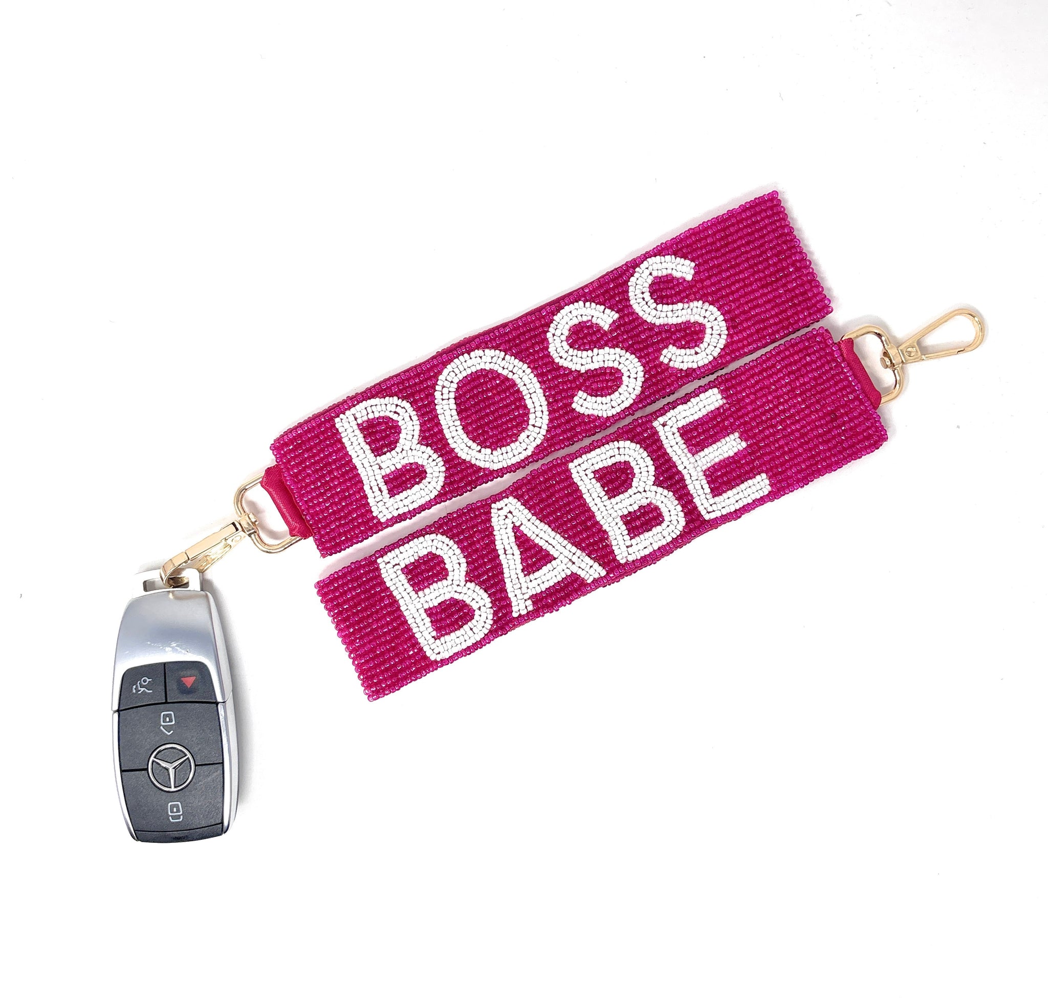 Elevate your everyday carry with this stunning hand-beaded wristlet strap that celebrates your bold spirit. Featuring "BOSS" on one side and "BABE" on the other, this versatile accessory works beautifully as a keychain, bag charm, or wrist accessory. Each bead is carefully crafted to create an eye-catching piece that makes a confident statement. Whether you're securing your keys or adding flair to your favorite bag, this beaded beauty combines style with functionality—the perfect way to carry your power with you wherever you go.