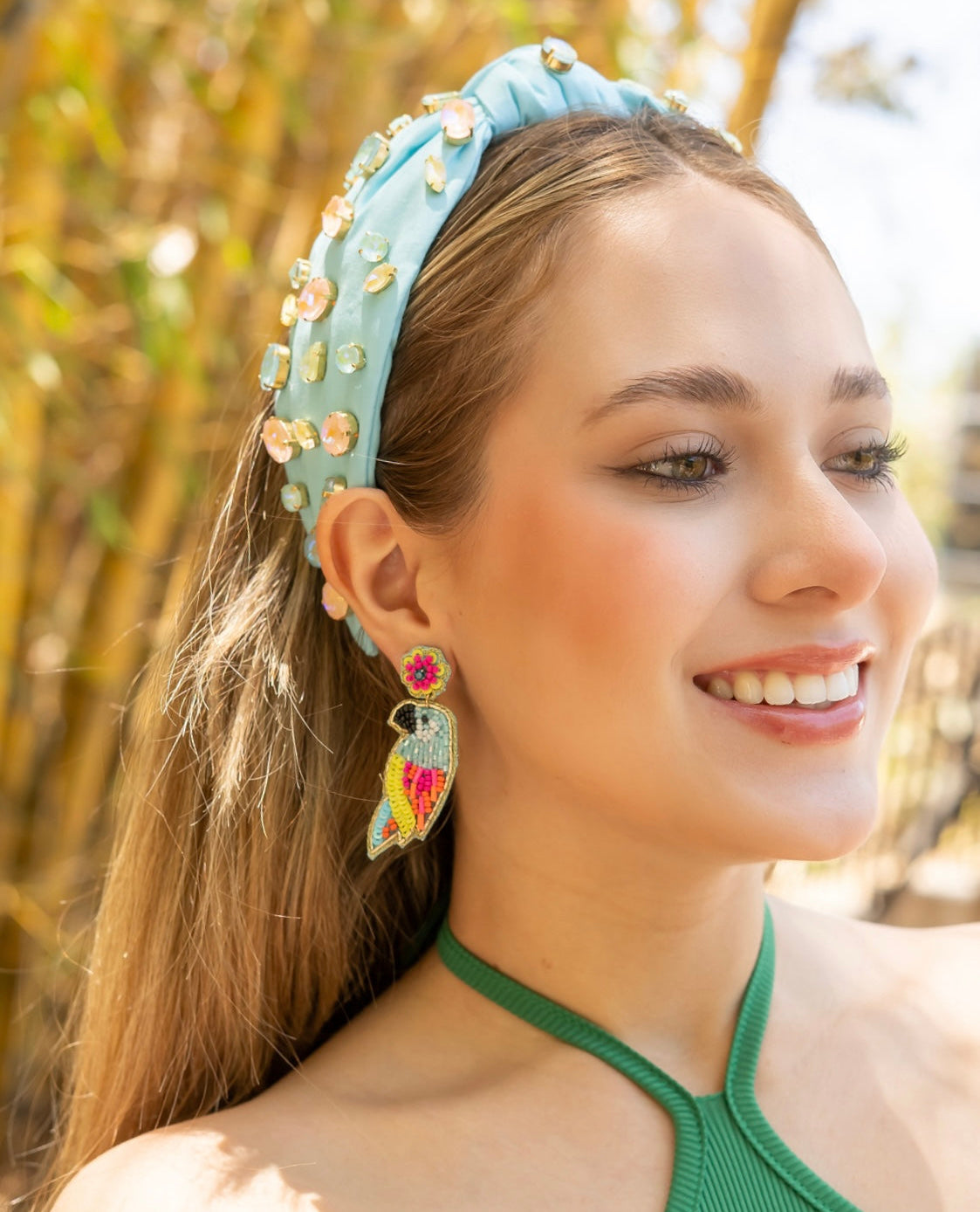 Add an exquisite touch to your spring/summer look with our Celeste Jeweled Knot Headband. Crafted from beautiful soft fabric, it features stunning color jewels for a chic and luxurious appearance. Elevate your style and stand out in this exclusive piece.