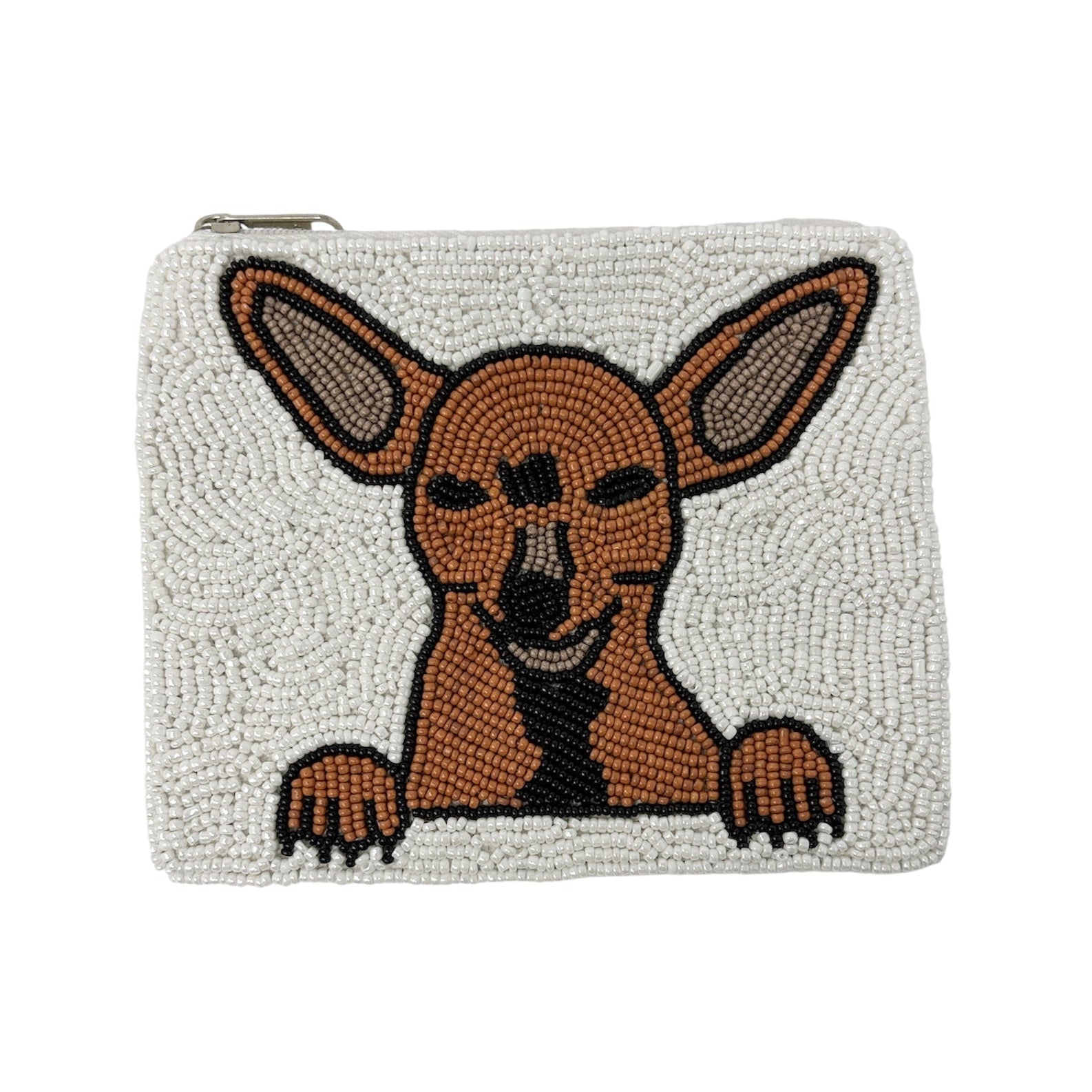 This hand-beaded Chihuahua Pouch Purse is a charming accessory for any dog lover. Its compact size makes it perfect for carrying your keys, cards, and small essentials with ease. Expertly crafted with detailed beadwork, this purse combines style and practicality, letting you showcase your love for Chihuahuas wherever you go.