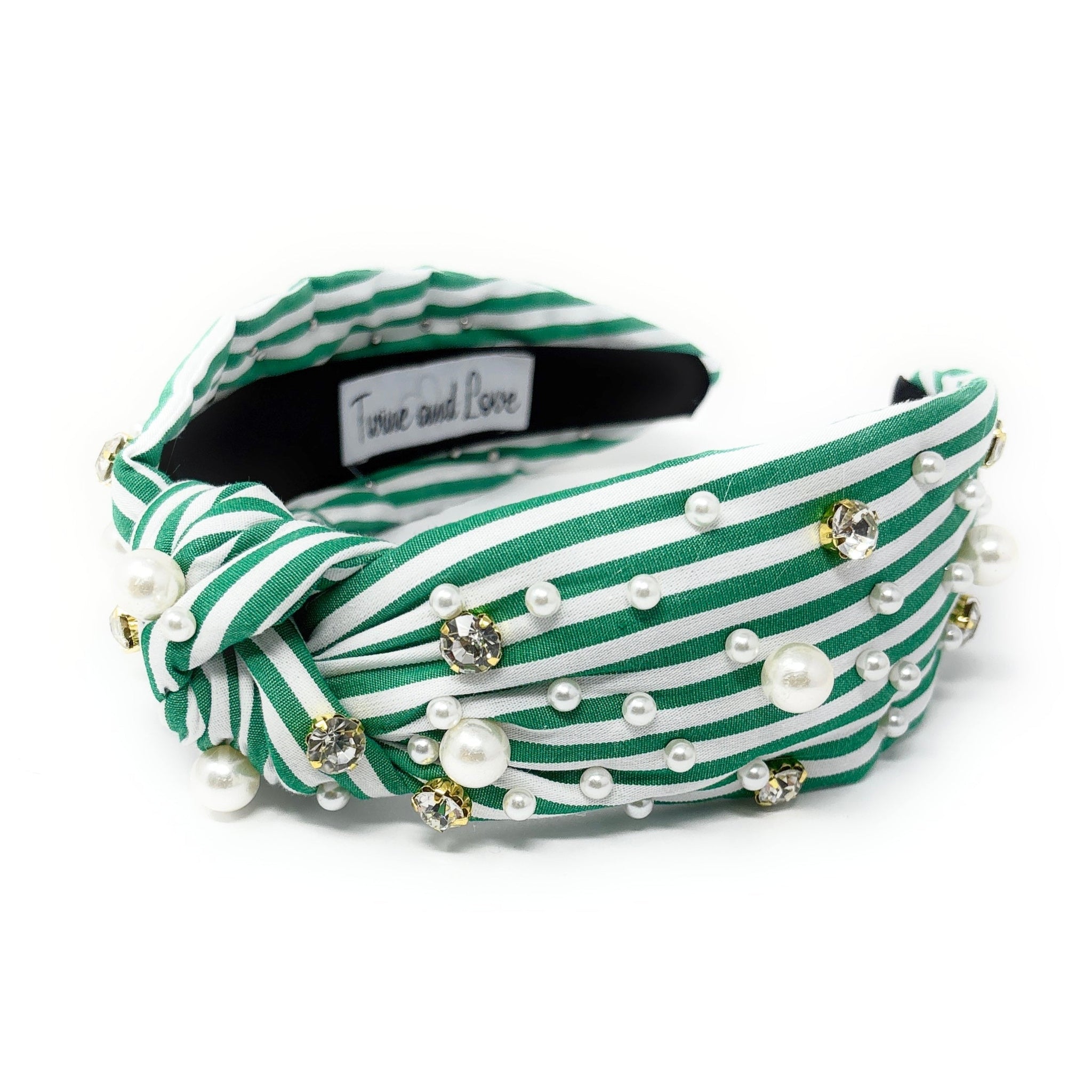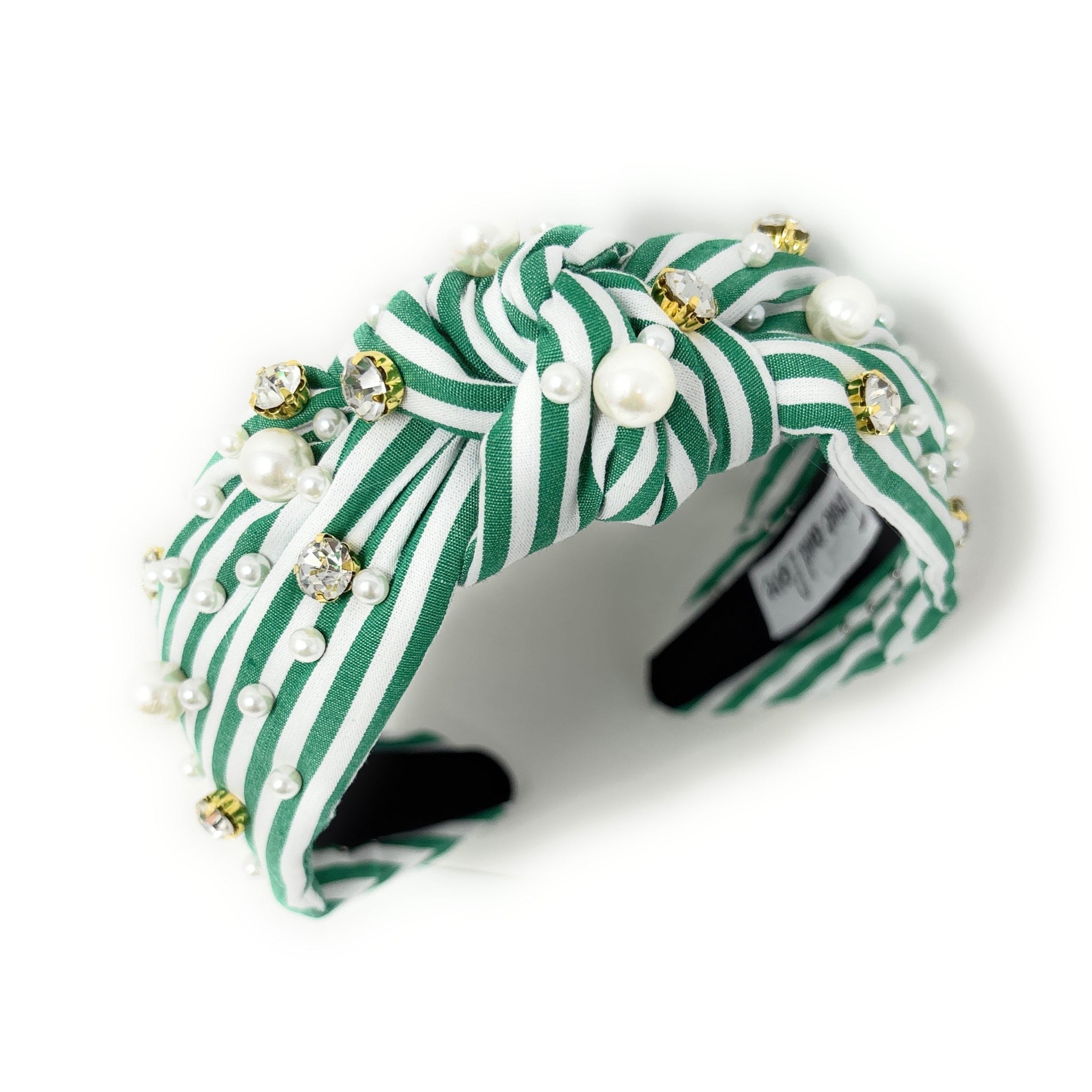 An essential accessory for your collection! Made from green and white striped fabric, this headband is beautifully decorated with jewels and pearls for a dazzling touch. It flawlessly blends fun flair with elegance, ideal for occasions when you want to shine with understated charm.