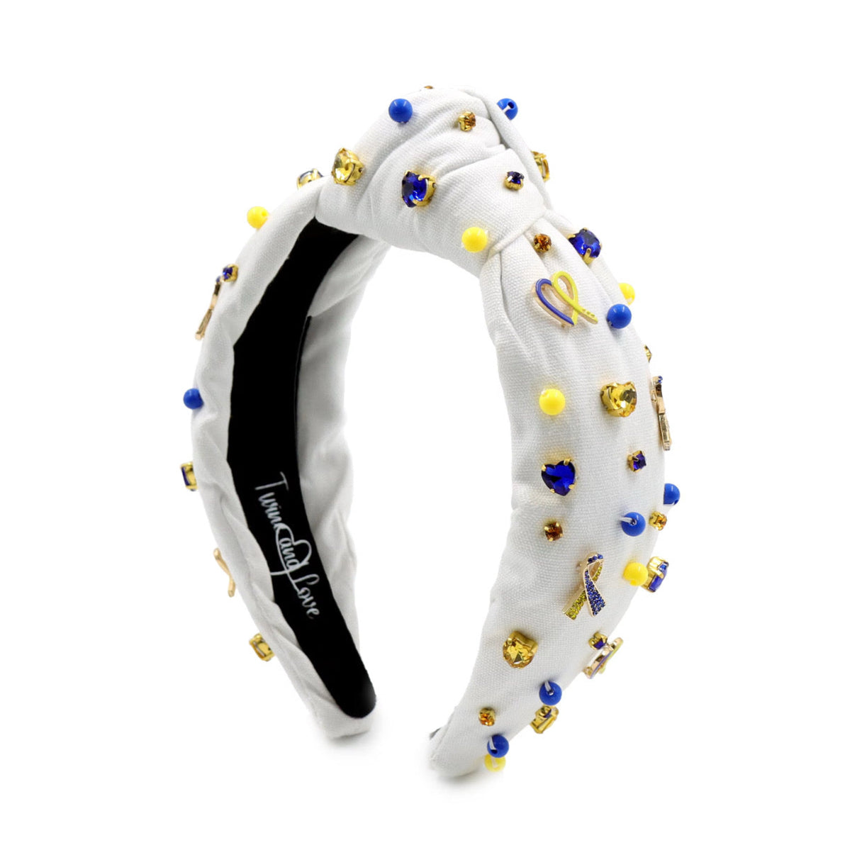 Elevate your style with this hand-sewn Down Syndrome Awareness Jeweled Knot Headband, a unique accessory that makes a meaningful statement. Adorned with sparkling gemstones and charms, it combines elegance with purpose. Wearing this headband shows your support and helps raise awareness while adding a standout touch to any outfit. A must-have piece for those who value both fashion and advocacy.