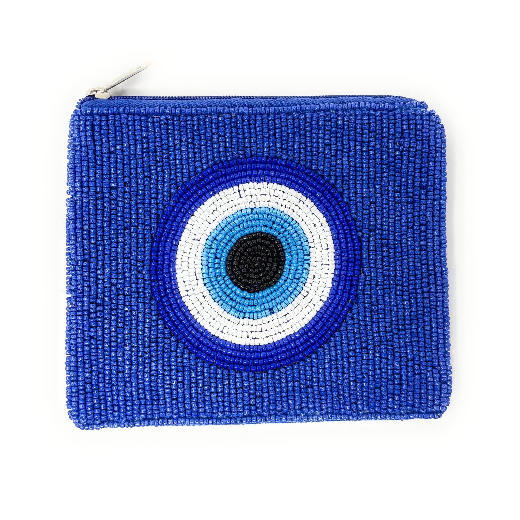 Handcrafted beaded pouch featuring striking blue shade beads with an evil eye design. Perfect for organizing keys, credit cards, coins, and small essentials. Secure zipper closure keeps your valuables safe and accessible. Compact size fits easily in pockets or bags, making it an ideal everyday carry accessory or thoughtful gift.
