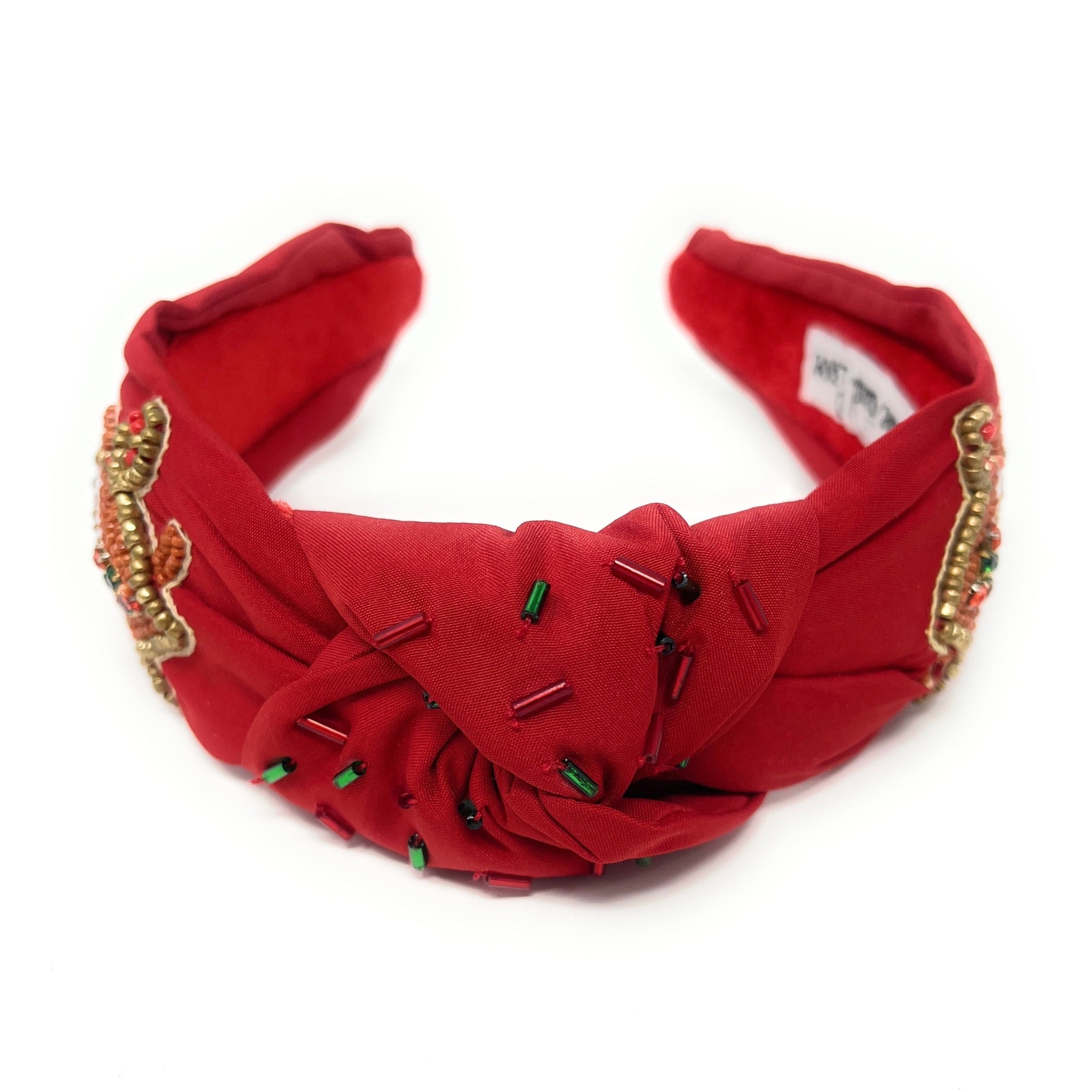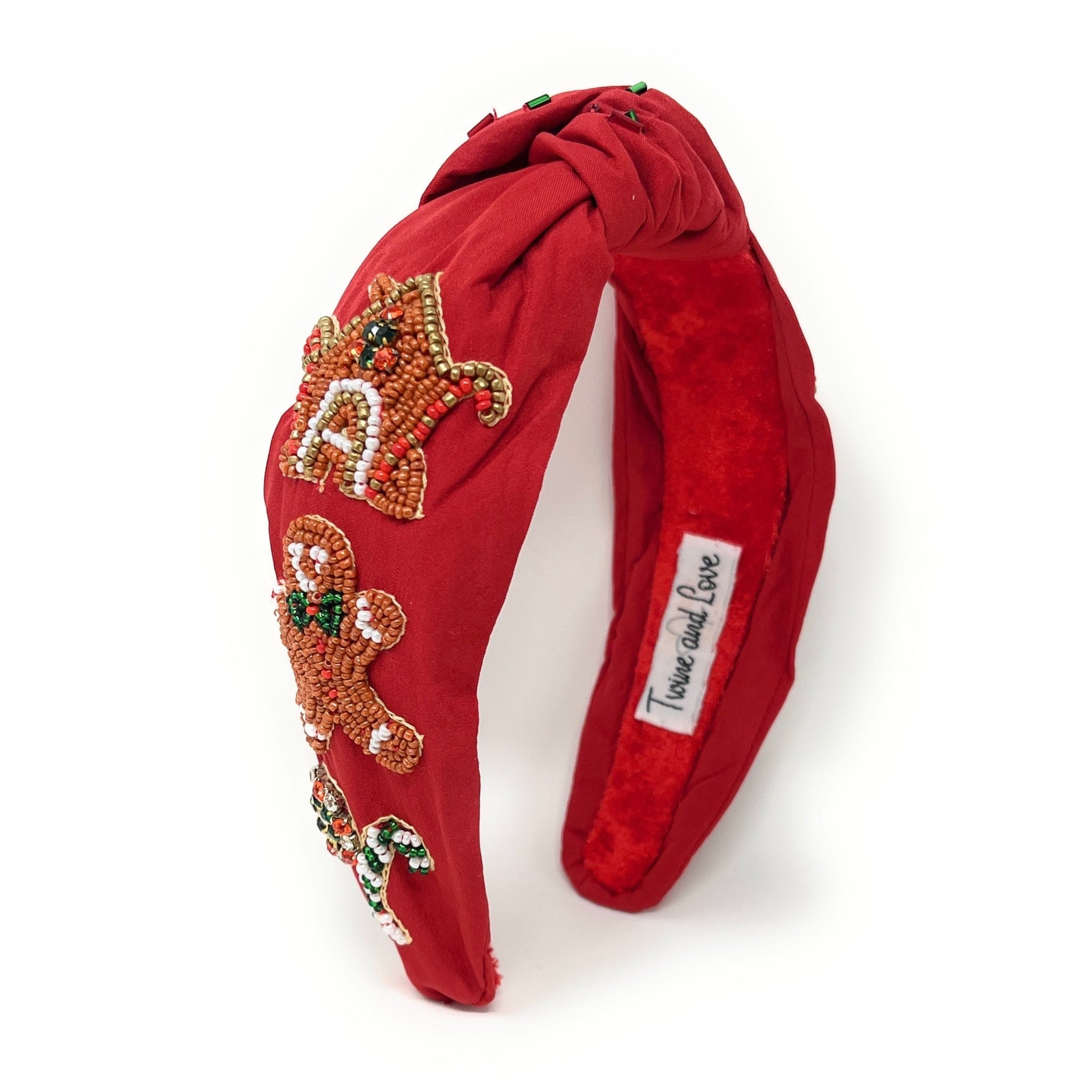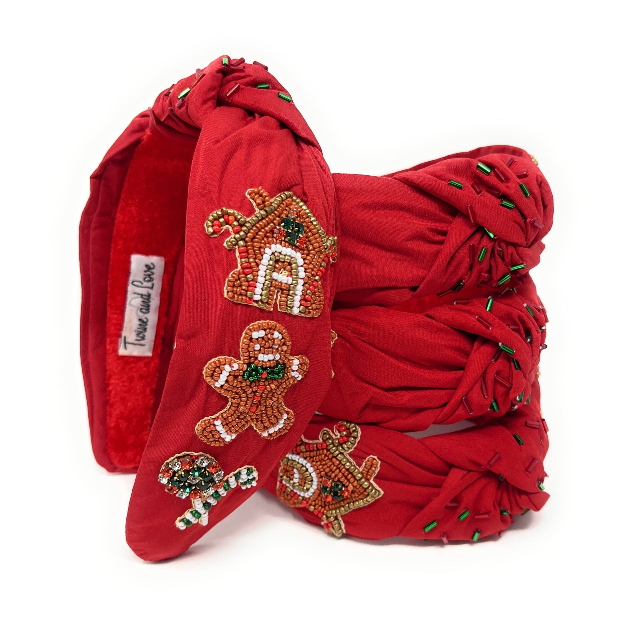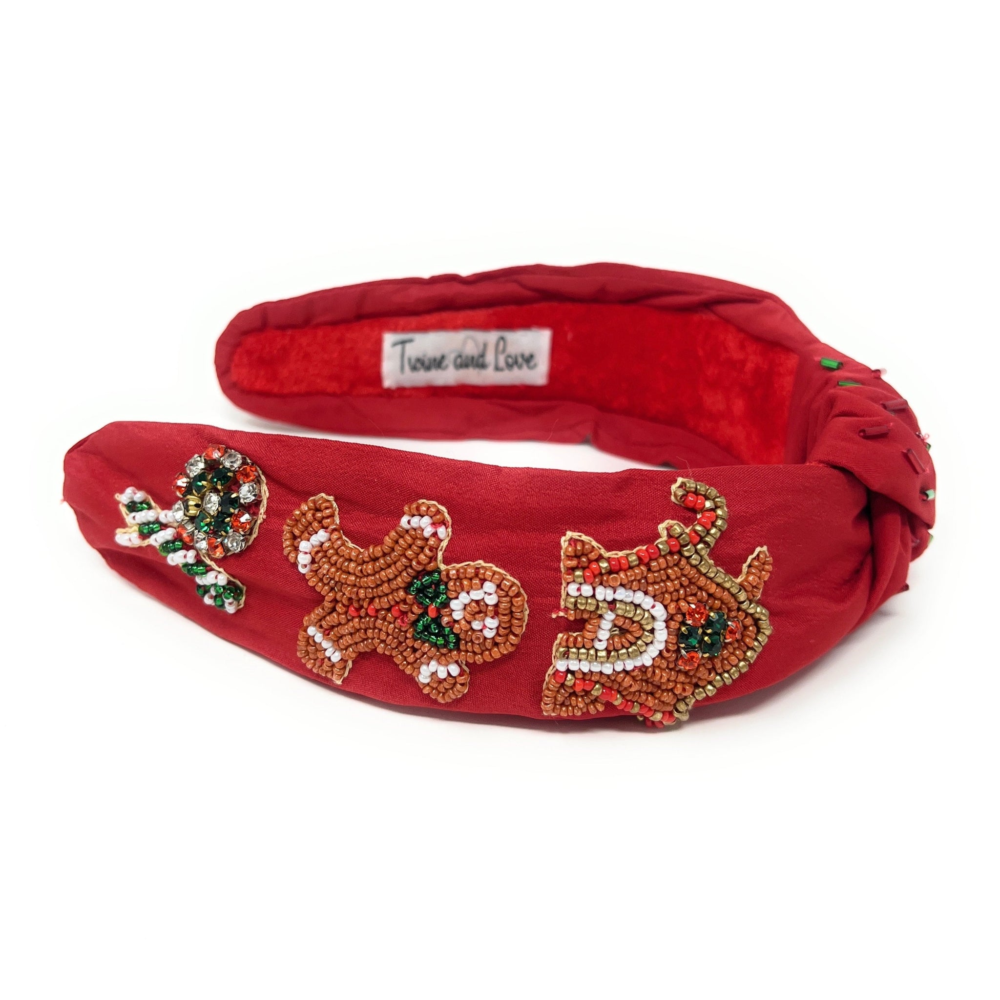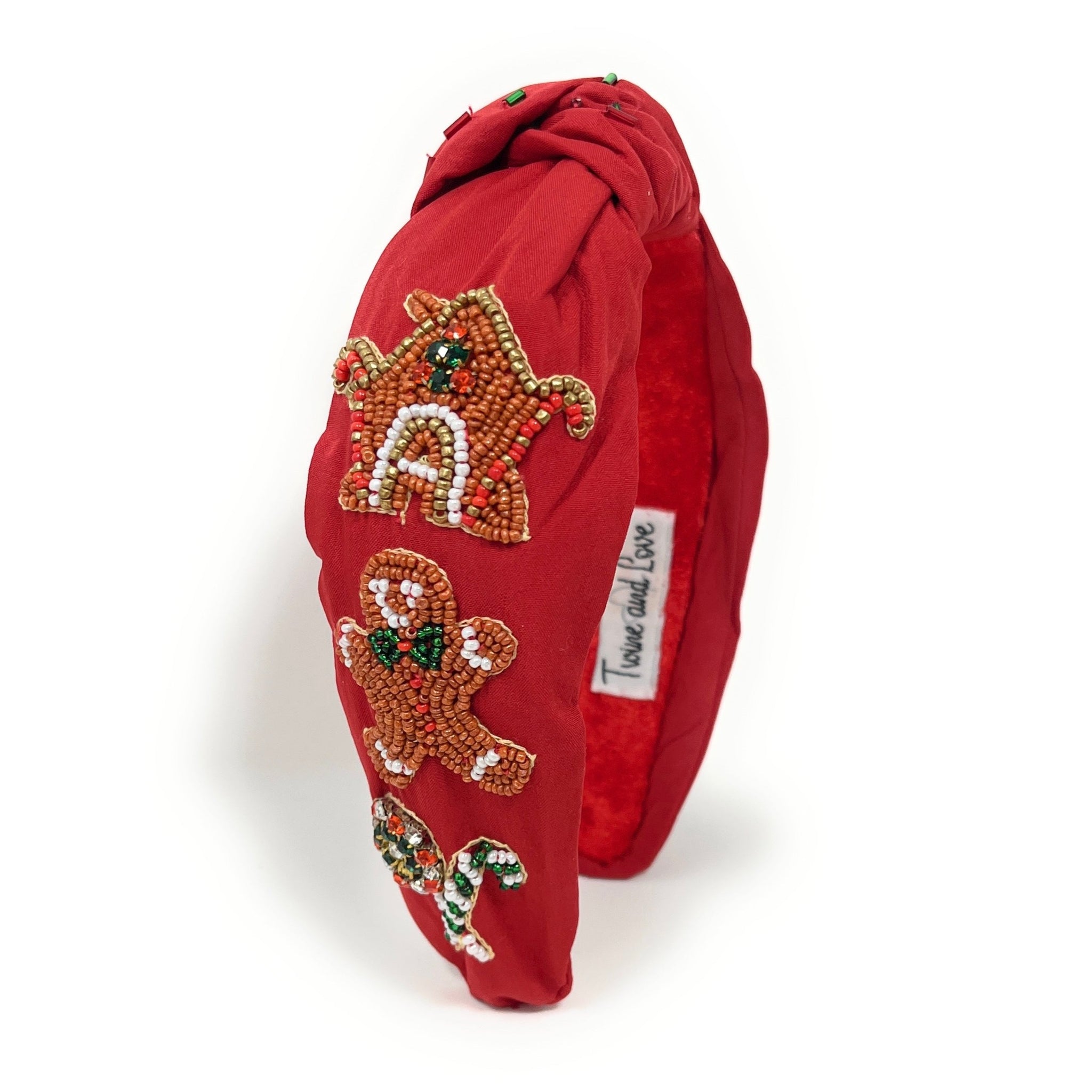 Celebrate the holidays in style with this exquisite handmade headband. Featuring beaded gingerbread man and house motifs, this lightweight accessory exudes effortless elegance and adds a festive touch to any ensemble. Crafted with love and care, our Hand Beaded Gingerbread House Knot Headband is guaranteed to be the perfect finishing touch.