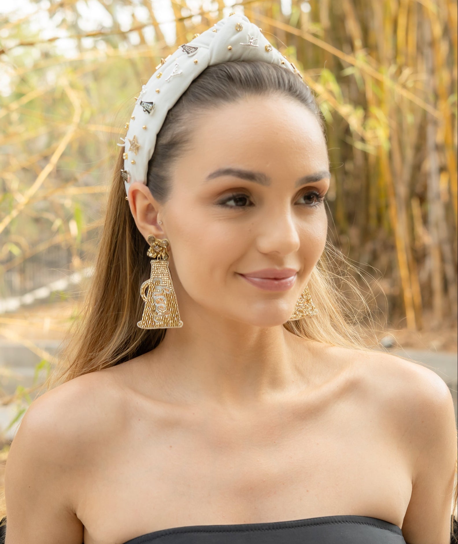 Elevate your cheerleader style game with our Hand Sewn Cheerleader Jeweled Knot Headband. Crafted with intricate hand sewn elements and adorned with dainty gold star charms, this stunning white fabric headband will effortlessly add flair and sophistication to any ensemble. Don't miss out - order now and stand out from the crowd on game day!