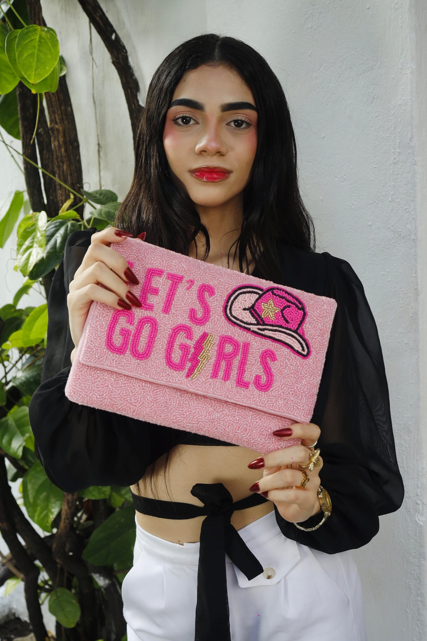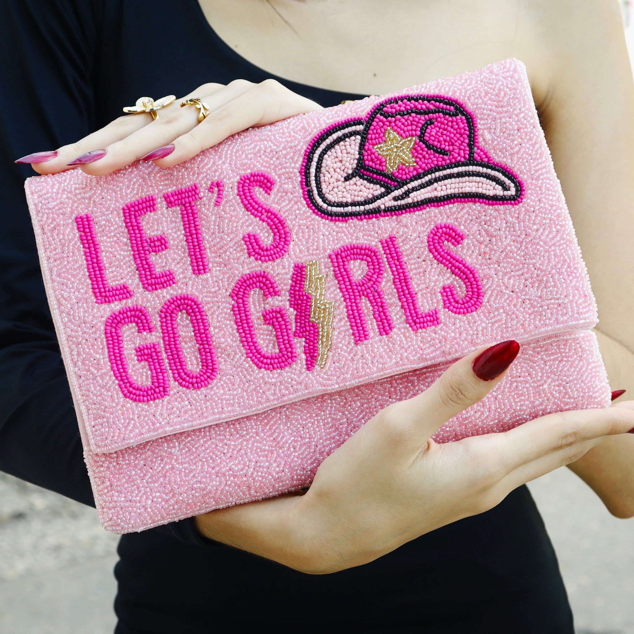 Elevate your style with the Let's Go Girls Beaded Clutch Purse, featuring meticulously hand-beaded pink shade beads for a unique sparkle. Designed to be worn as a clutch or crossbody, it offers versatile elegance for any occasion. Its perfect size fits essentials without bulk, making it an ideal accessory for day-to-night looks. Add a touch of handcrafted charm and practicality to your wardrobe with this standout purse.