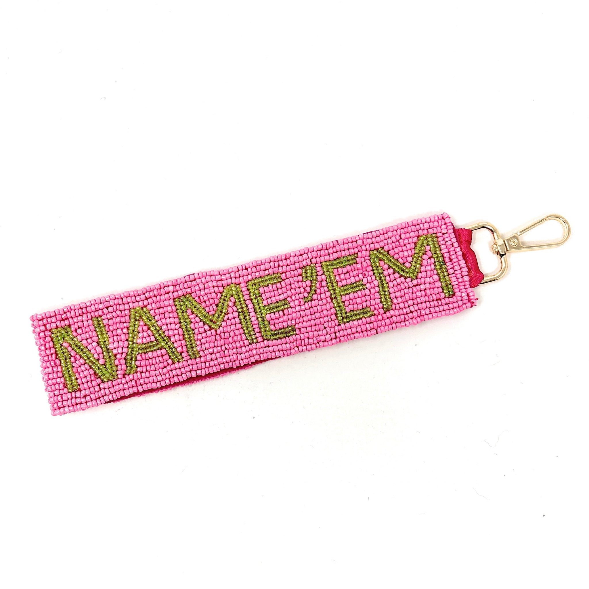 Discover endless styling possibilities with our Name'Em Beaded Keychain Wristlet Strap. This hand-beaded accessory transforms any bag into a statement piece with its sophisticated design and versatile. Whether you're securing keys, adding flair to a tote, anchoring a water bottle, or creating the perfect bag tag, this elegant strap adapts to your lifestyle. The intricate beading catches light beautifully while remaining comfortable for everyday wear. Mix and match with our coin purses and pouches, or pair with your existing collection for a personalized look that reflects your unique style. Size 2"x 7"