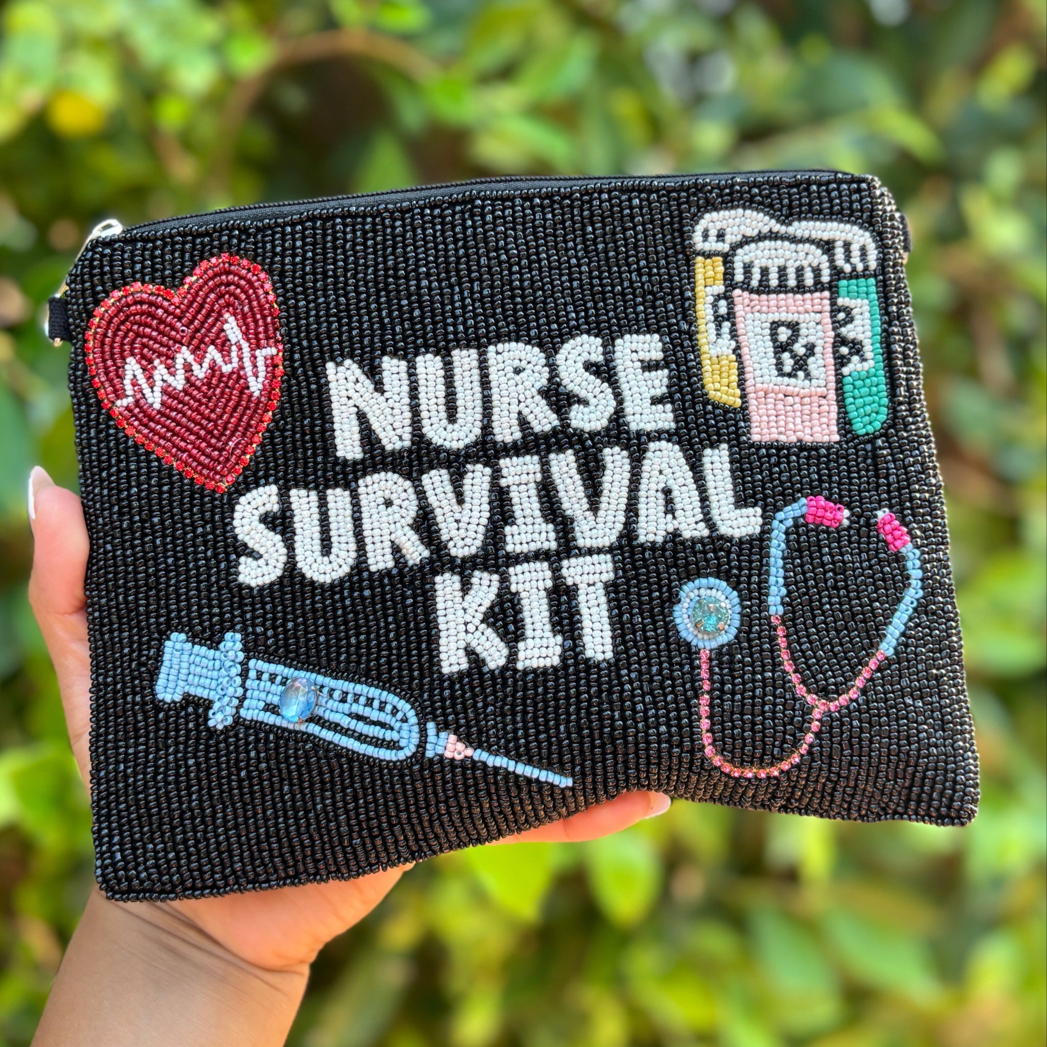This hand-beaded Nurse Survival Kit pouch is a beautiful and thoughtful gift for nurses. Perfectly sized to hold essentials and cosmetics, it offers both style and practicality. Featuring an included chain, it can be worn as a convenient crossbody bag, making it ideal for busy professionals on the move.