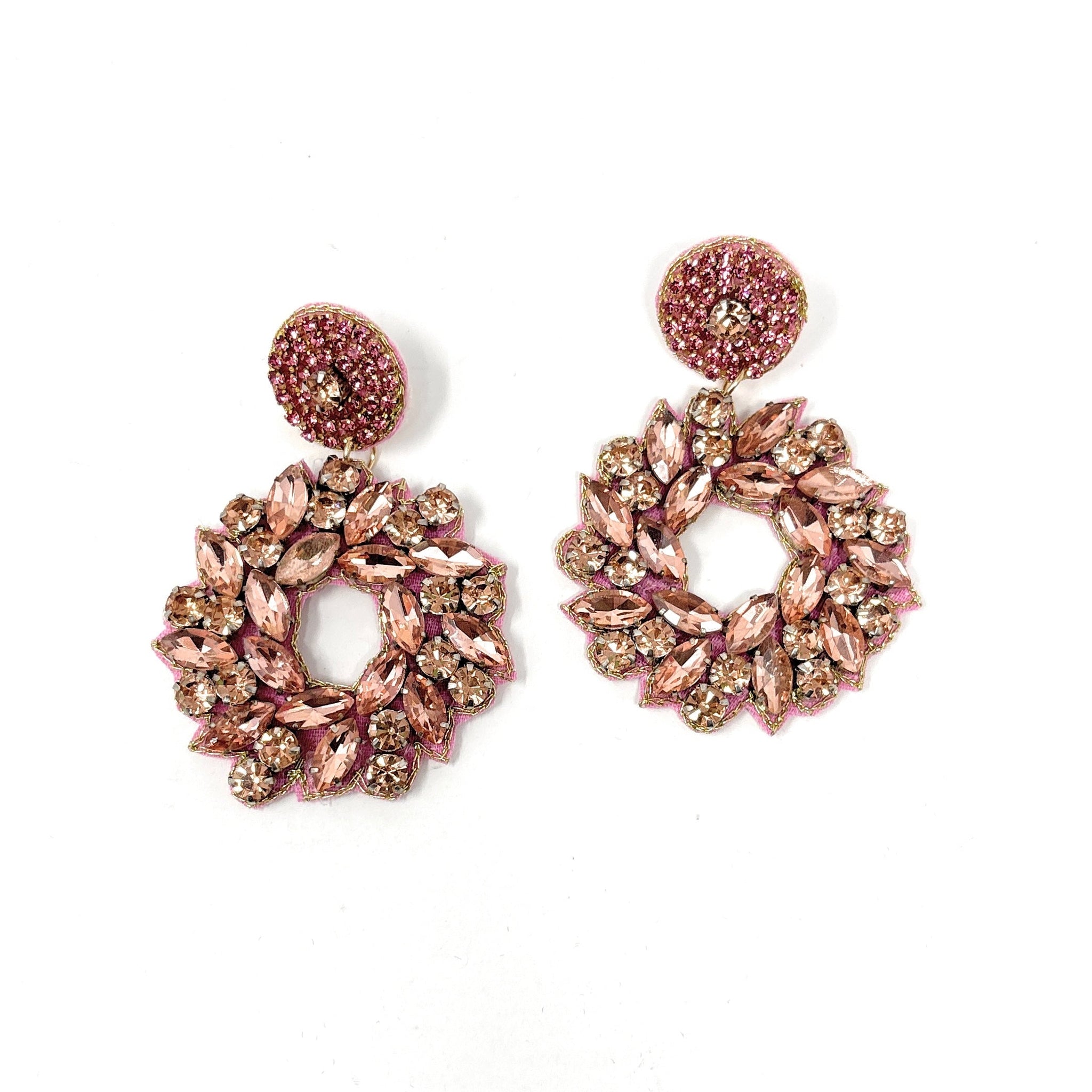 Discover the allure of handcrafted luxury with these Wreath Jeweled Earrings. Each piece is meticulously hand-beaded with shimmering jewels arranged in an elegant wreath pattern that radiates sophistication. The intricate beadwork creates a mesmerizing play of light, making these earrings an irresistible statement piece for anyone seeking distinctive, artisan-quality jewelry. Whether you're dressing up for a special occasion or adding polish to your daily style, these beautifully crafted earrings deliver timeless elegance that truly stands out.
