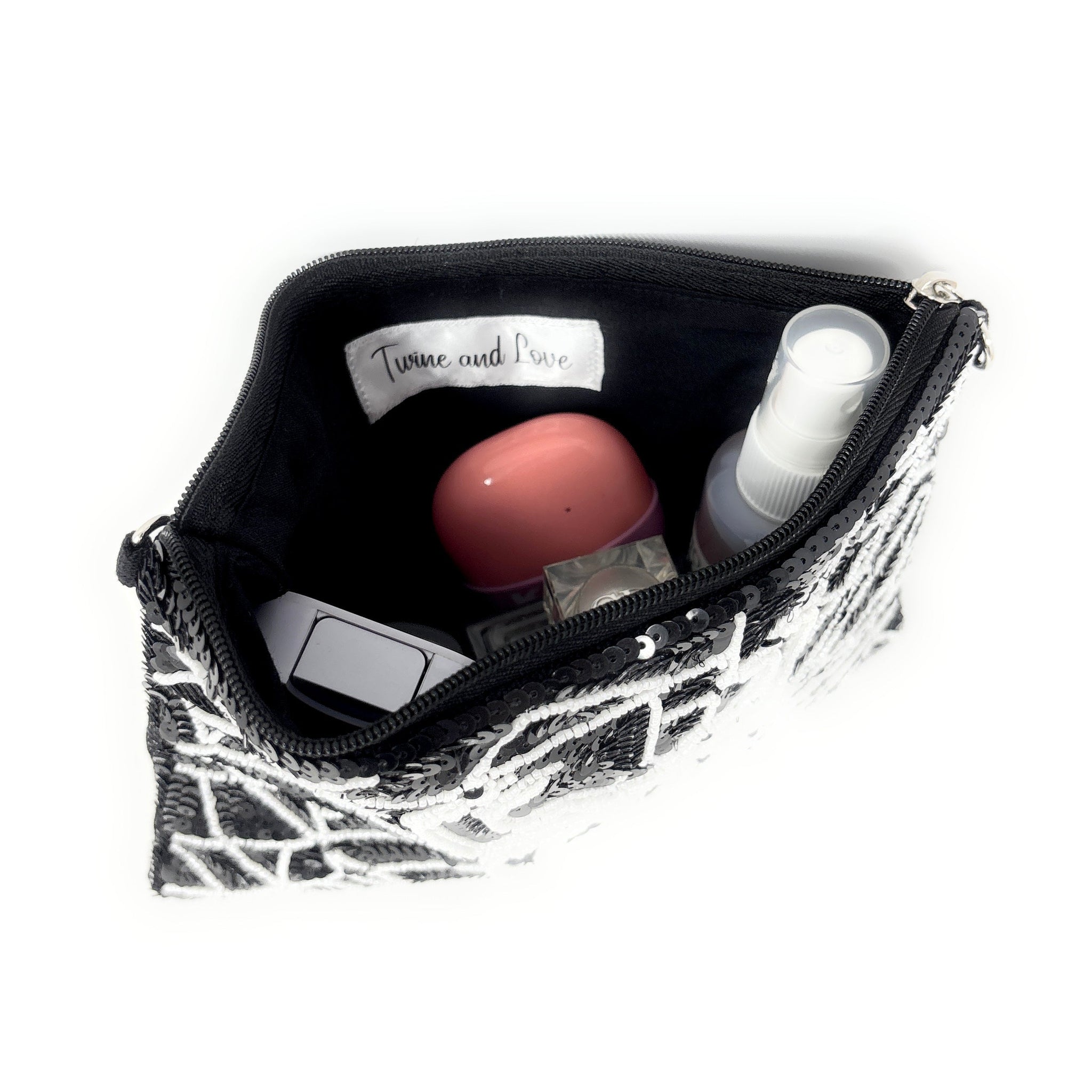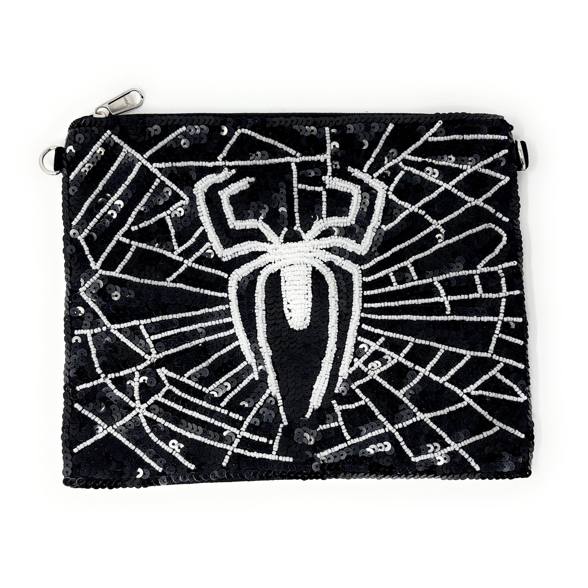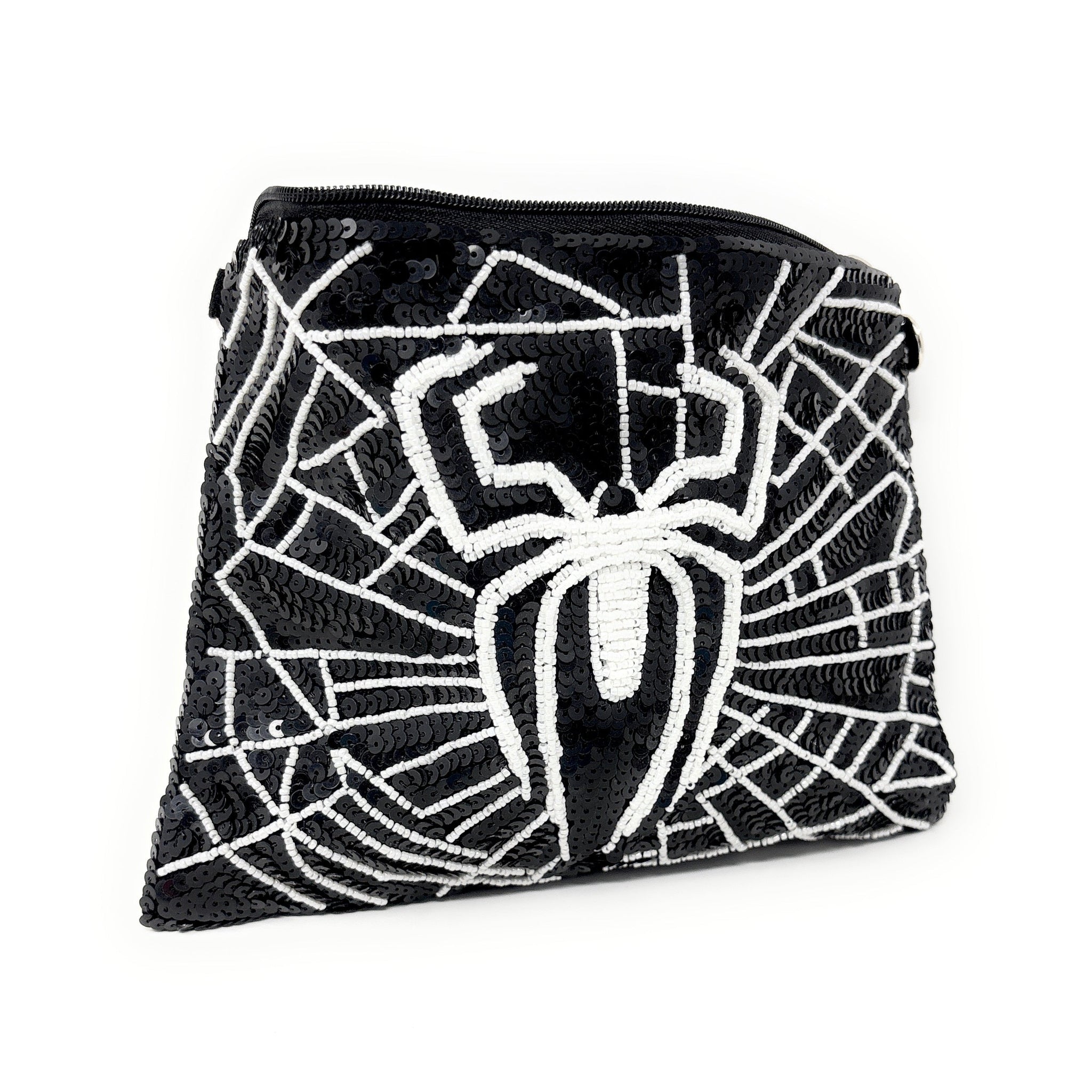 This hand-assembled pouch exemplifies refined craftsmanship with its captivating spider web design rendered in luminous beads and sequins. Versatile and elegant, it functions beautifully as both a makeup organizer and crossbody bag, complete with a delicate silver chain. The spacious interior provides ample room for your essentials while the intricate beadwork serves as a conversation-starting accessory. A sophisticated choice for those who value artisanal quality and distinctive style.