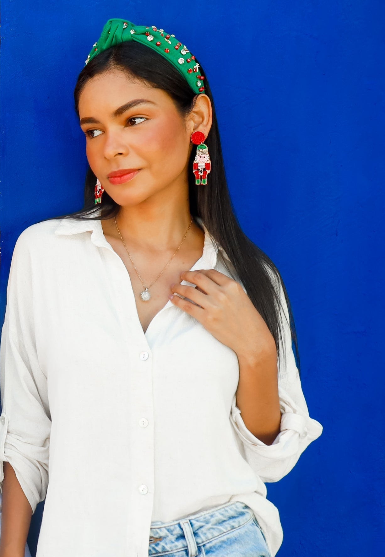 Elevate your holiday look with our handcrafted Green Holiday Jeweled Knot Headband. Beautiful and chic, this top knot headband is a must-have for the season. Add some sparkle and style to any outfit and make a statement at every holiday event.