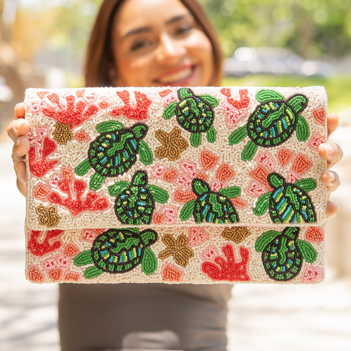 Indulge in the beauty and craftsmanship of our Sea Turtle Beaded Clutch Purse! This must-have accessory boasts a stunning, hand-beaded sea turtle motifs on its front side. With its chic design and intricate details, this clutch is a true work of art. Elevate your style and make a statement with this beautiful piece.