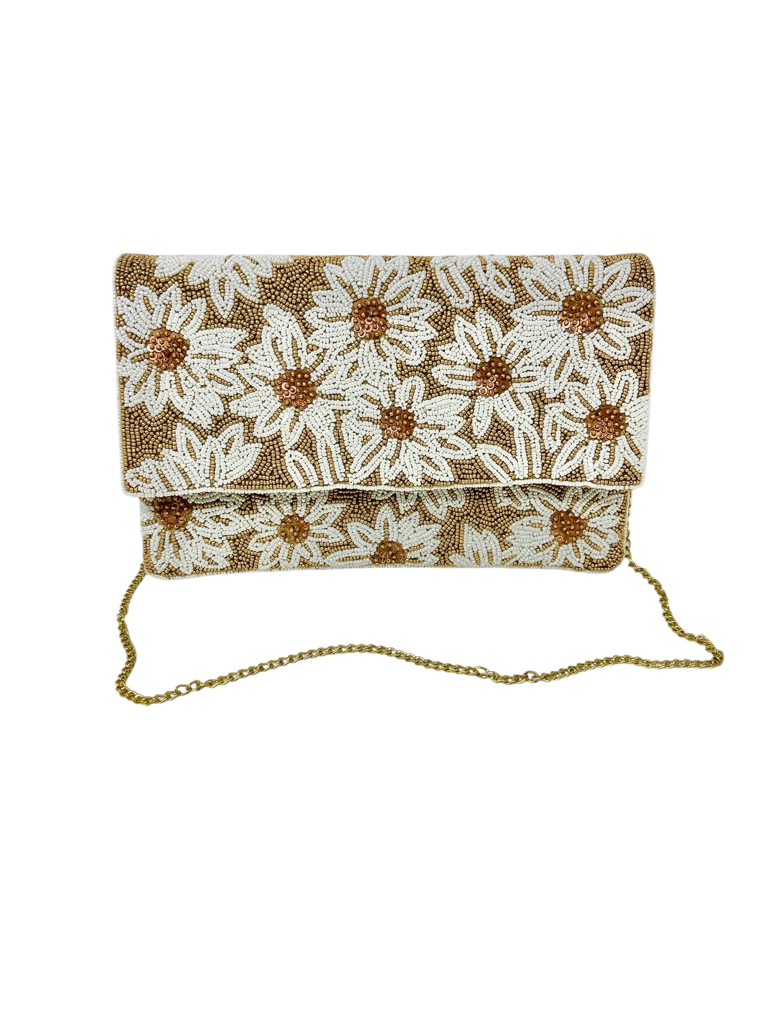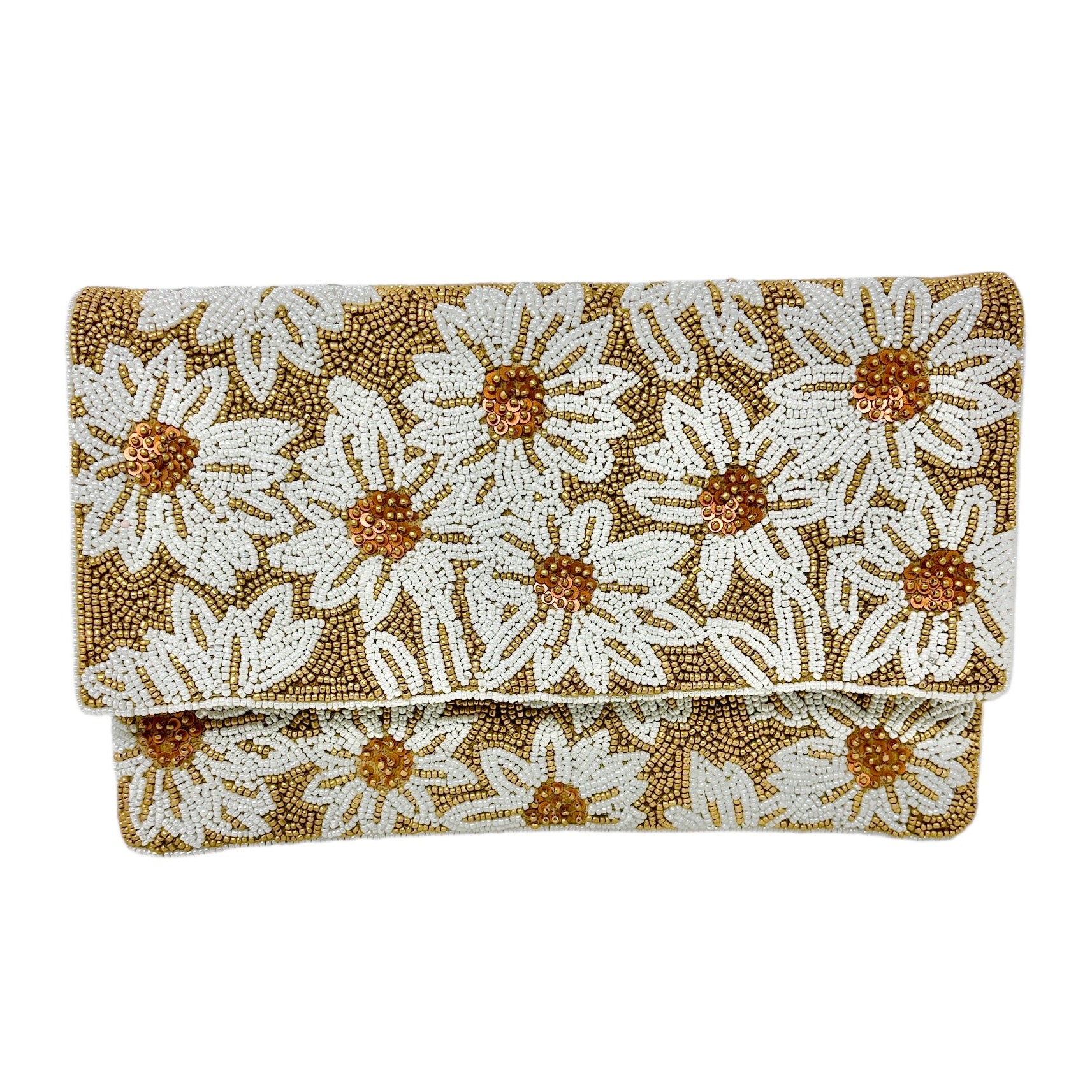 Elevate your style with our beautiful White Flowers Beaded Clutch Purse. Hand-beaded for detail and elegance, this perfect size purse can be worn as a crossbody or clutch. The entire front of the clutch is covered in white and bronze beads. Make a statement with this stunning accessory.